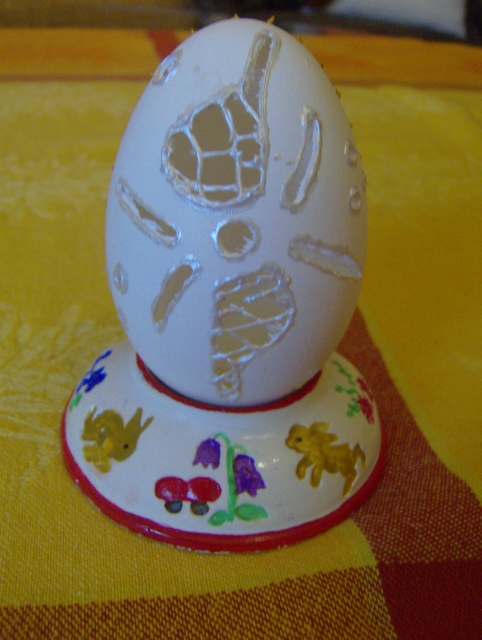 Jajo (wydmuszka gęsia)zrobiłam dziś w nocy,chciałam od razu zdjęcie zrobić,ale tak pstrykałam,że aż mi baterie wysiadły,nie jest superowe,ale ja bardzo jestem z niego zadowolona,ponieważ w jaju wierciłam pierwszy raz,a że wiertarka była bardzo blisko moich rąk,więc nie dało mi to spokoju,choć byłam już bardzo śpiaca,ale musiałam najpierw zrobić to co zaplanowałam,chciałam nauczyć się tej techniki,no i muszę Wam powiedzieć,że chyba mnie do tego wciągnie,była to dla mnie super zabawa!Pierwsze jajo było dla mnie przeznaczone na zniszczenie,ale jednak go nie wyrzucę,jest jakie jest,ale liczy się to,że jest ono pierwsze w tej technice,próbowałam tam różnych sposobów trzymania wiertła,mam nadzieję,że następne będą już miały inne wzorki,no i przez jajo poszłam spać o godz 4.30 rano,ale osiągnęłam to co chciałam:)